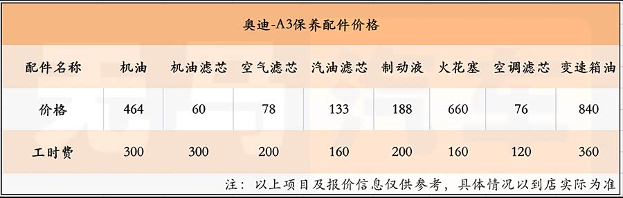 从配件价和工时费来看,全新奥迪A3家族确实不负“豪华”之名,除了几个滤芯配件价格较为亲民以外,其他费用项目可谓给足用户“牌面”……好在其首保免费,且保养频率不高,一定程度上起到了压低整体保养费用的作用。