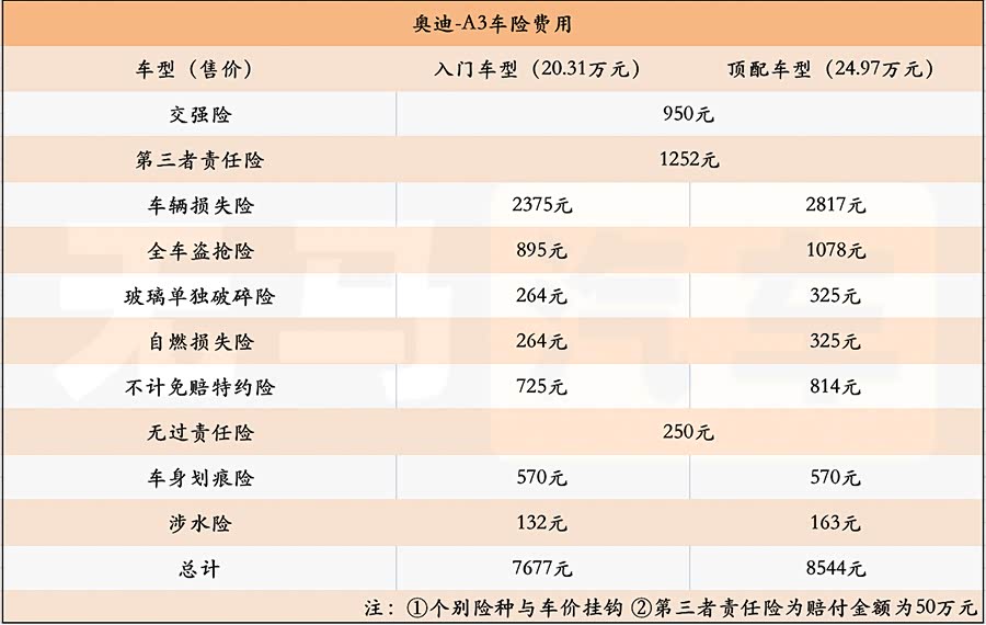 全新奥迪A3家族共推出12款车型,其中两厢标准轴距版A3 Sportback共推出6款配置车型,售价区间为20.31-24.32万元,长轴三厢版A3L Limousine亦推出6款配置车型,售价区间为20.96-24.97万元。而个别险种又是与车型售价挂钩的,经计算,奥迪A3的保险费用区间为7677-8544元。