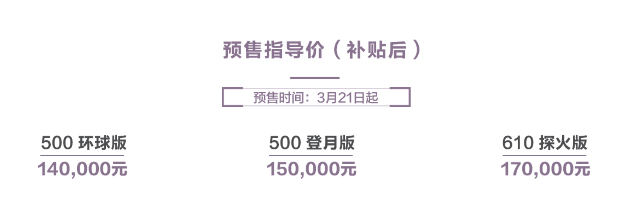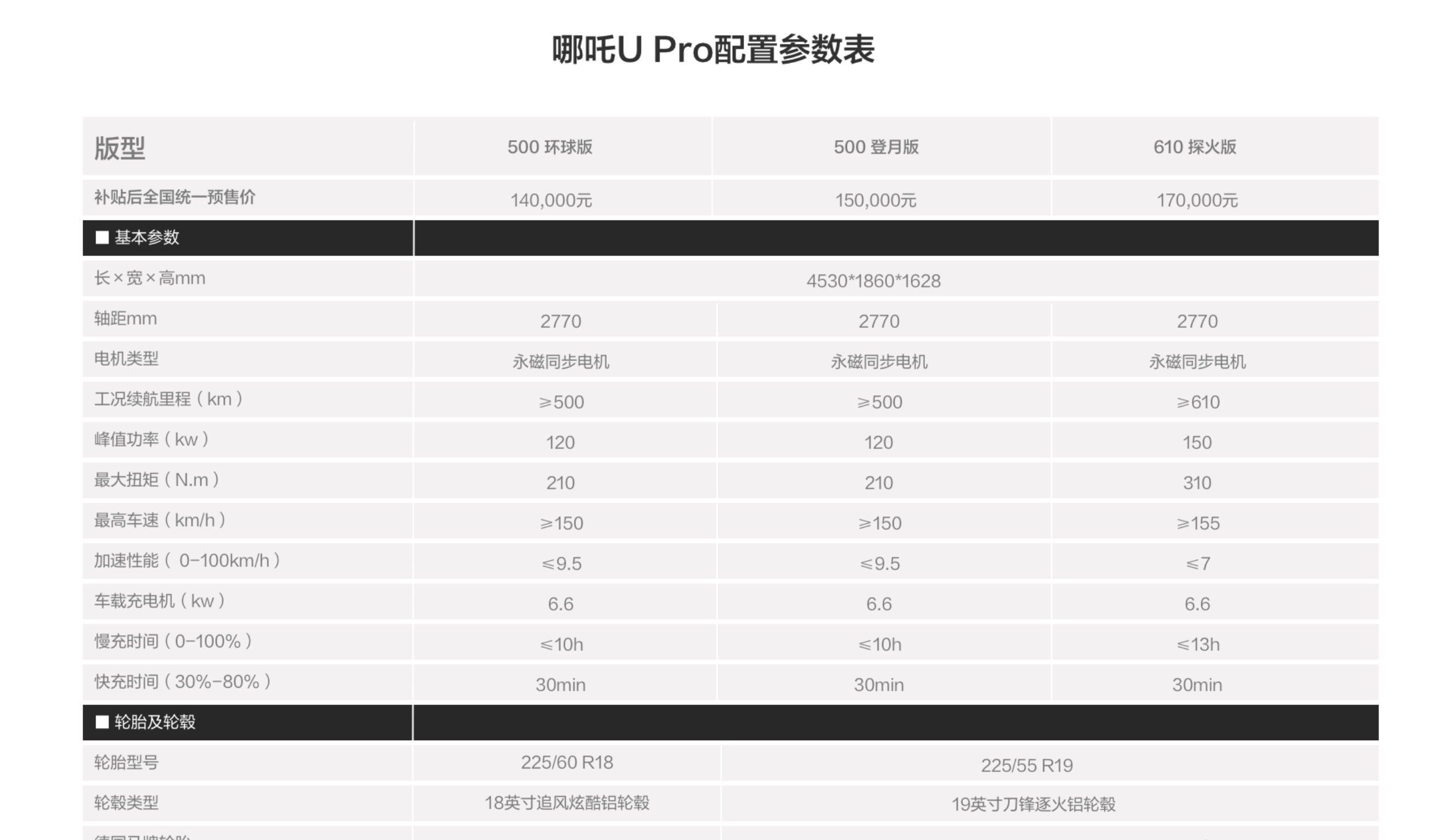 动力部分,本次预售的三款车型均搭载永磁同步电机,500环球版/登月版最大功率120千瓦,峰值扭矩210牛·米;600探火版最大功率150千瓦,峰值扭矩310牛·米。