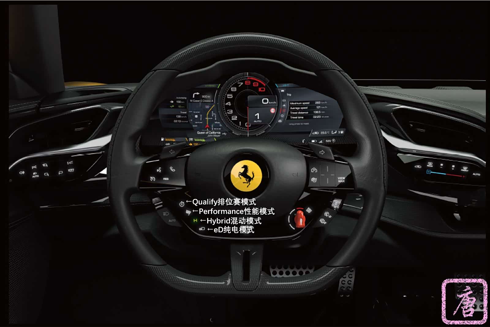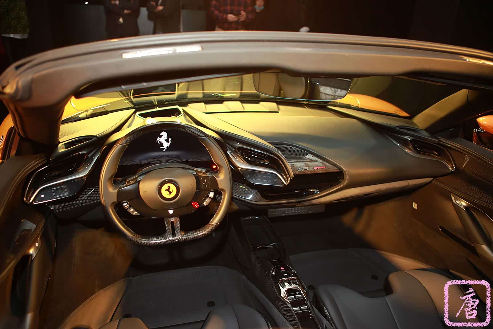 由于现场车辆没有通电,所以我们找了一张SF90 Spider方向盘的展示图。首先,传统运动式方向盘得以传承,配以碳纤维材质与真皮所搭配。整个方向盘的主要功能区域分布与以往法拉利车型并没有过多改变,如果你是一位法拉利的“老司机”,那么相信这一布局一定不会陌生。其次,法拉利此次也是在SF90车型上首次采用了全液晶仪表盘,不过布局依旧是那么“法拉利”。中间为炮筒式转速表,一侧为多媒体音影控制、另一侧为导航屏幕。