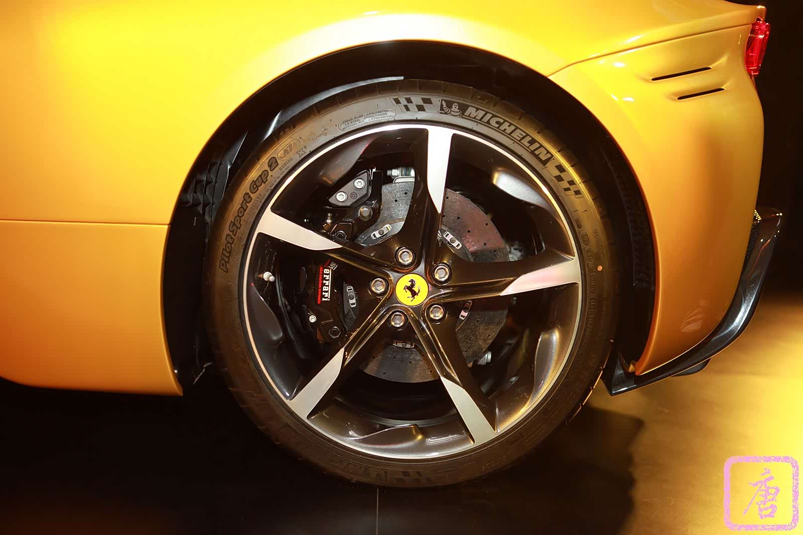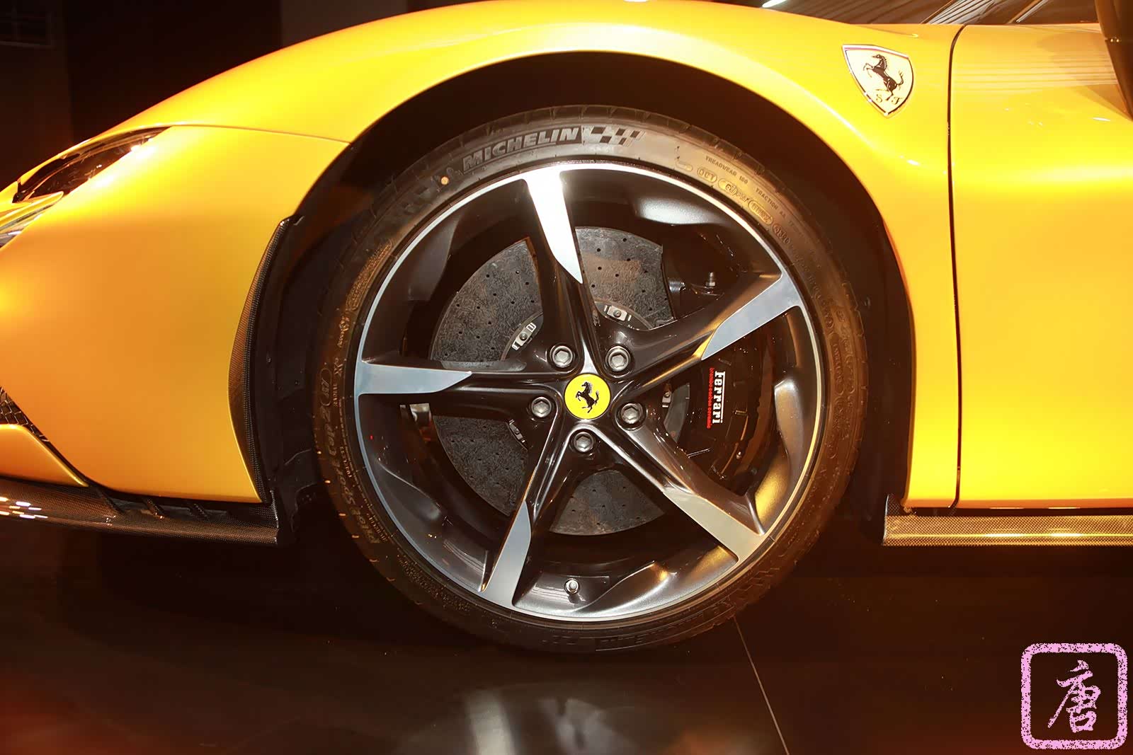 作为合作伙伴,米其林轮胎还专门为法拉利SF90定制了专属的Pilot Sport Cup 2 K2高效半热熔胎,K2就是法拉利公司的专属定制标记。轮胎尺寸为前225/35 ZR20、后315/30 Z20,配合20寸五辐式双色轮毂与大号刹车卡钳,霸气十足。