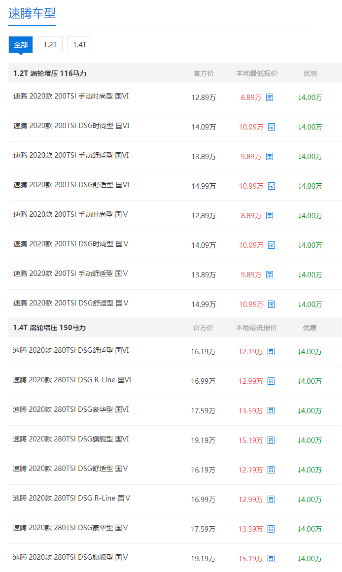 车家号·0浏览·2021-04-06 15:32 · 广东大家好,小编近日从苏州当地的某汽车经销商处获悉,该地区速腾目前购车最高优惠4万元,8.89万元起售,同时商家表示,近期上门试驾看车的客户就有机会获得商家精心准备的爱心礼品,欢迎各位朋友上门详询。下面我们先来了解一下速腾吧。