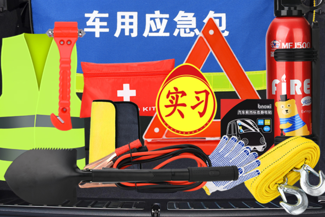 应急包一般包括三角警示牌、反光背心、灭火器、雨衣、搭电线、拖车绳、双头两用改锥、点胶手套、前挡静电贴、停车牌等。