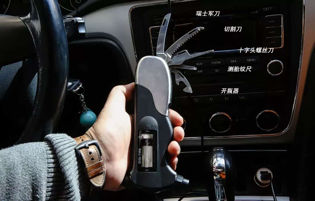 因此我比较推荐买多功能的,它可以测胎压、照明,瑞士军刀、安全锤,所以说它是非常实用的,买来自驾游外出肯定能用得上。