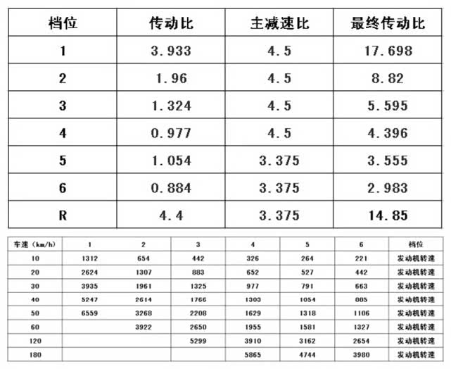 那么汽车倒挡行驶时最快能有多快呢?我们不妨来简单计算一下。下面是某款六速手动变速箱的传动比,以及各档位所对应的车速、发动机转速。我们就用它为例来看一下倒挡的最高速度能达到多少。