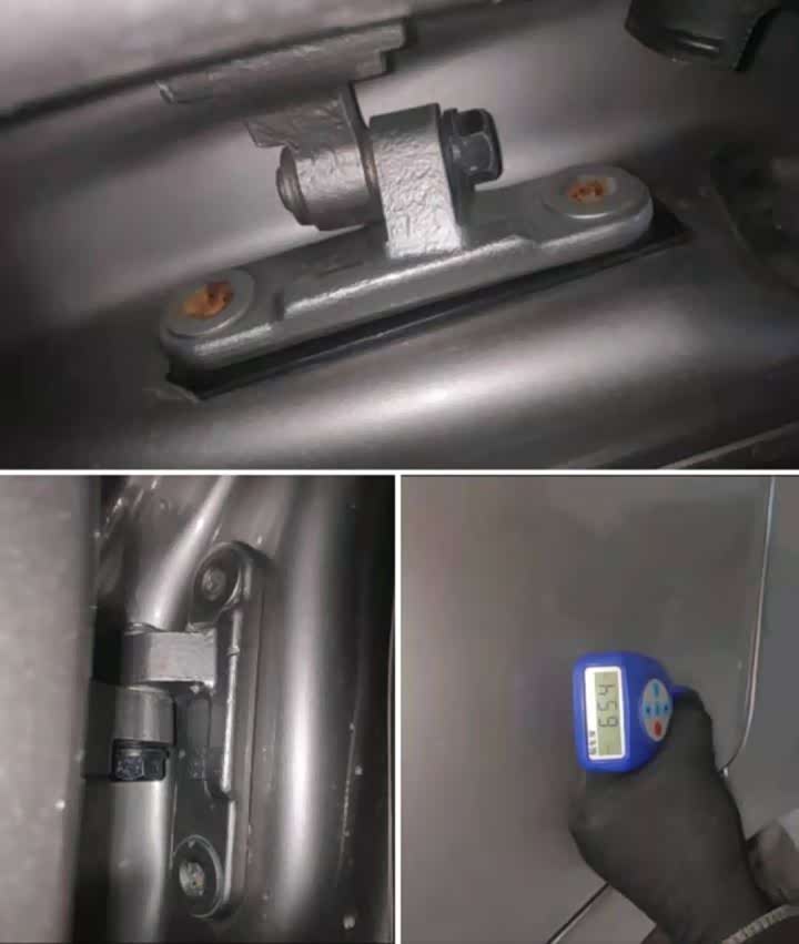 右侧两个车门都有更换,跟左前叶子板一样,车漆厚度偏低,车门固定螺丝和限位器螺丝都有拆卸。既然车门更换了,我们就要注意内门框和两侧ABC柱以及上下边梁这些车体框架结构有没有损伤。