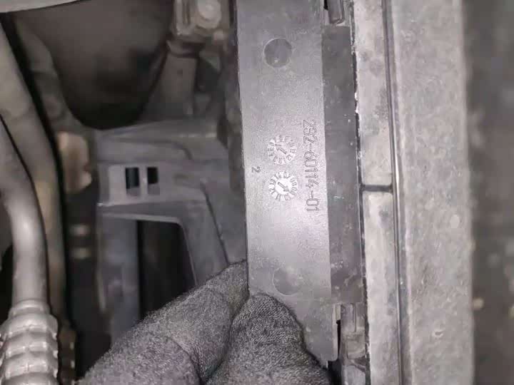 机舱前部水箱框架上横梁拆过,不过水箱、风扇和冷凝器都是完好的,出厂日期为2009年06月,符合原车出厂程序,而且没有碰撞损坏痕迹,固定螺丝无拆卸。