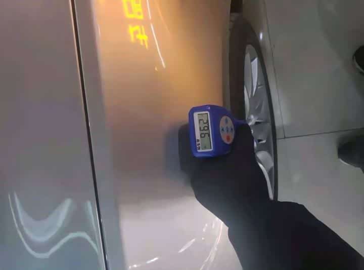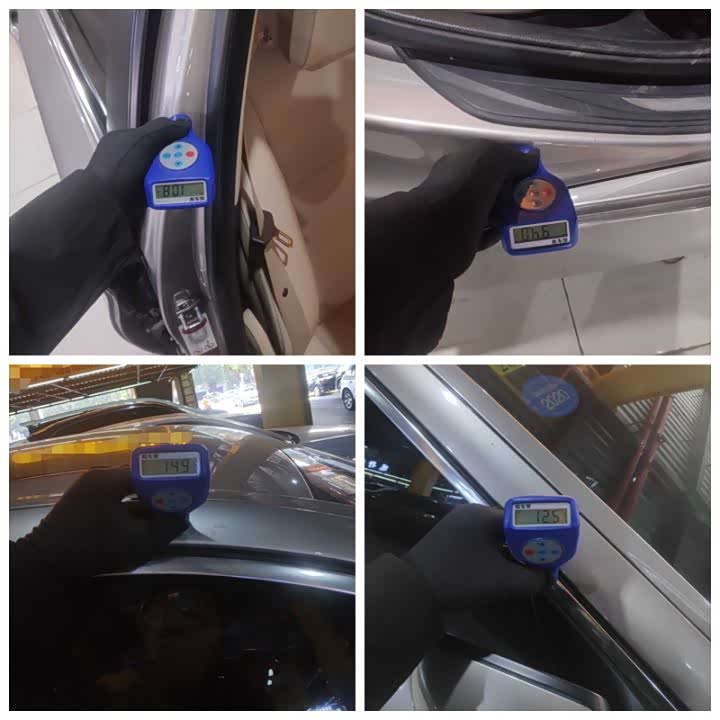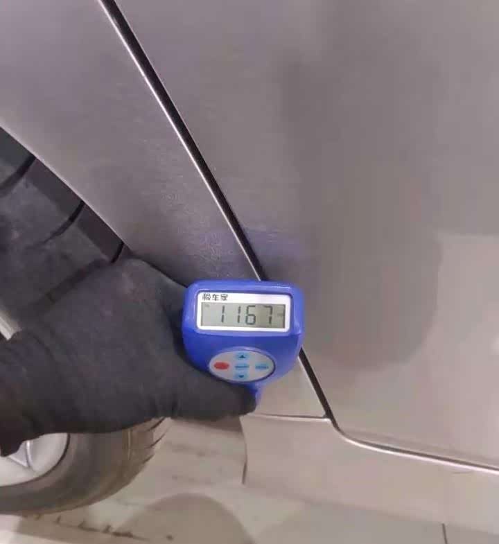 左边两个车门的漆面厚度分别为724μm和1630μm,都比较高,已经达到了钣金修复的范围,就是配件有磕碰变形的时候,先钣金敲打恢复原状,然后打腻子抹平表面,再喷涂油漆。因为加上了腻子的厚度,所以漆面测出来就比较厚。看了两个车门固定螺丝都是原封未动,说明只是钣金喷漆,没有更换配件。
