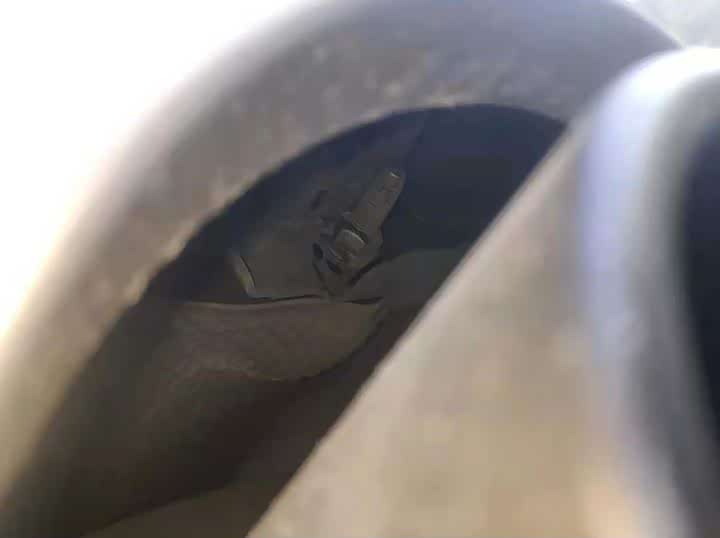 后保险杠缝隙内肉眼可见飞漆痕迹,而且内部发现新旧色差,固定螺丝也拆了,确认后保险杠更换无疑。