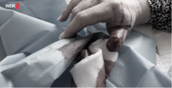 巨大的力直接把大拇指夹断,并且夹断的部分已经完全变形,无法缝上继续使用。Schweineberg女士表示直到今天她还能感受到幻肢痛(已被截去的肢体的疼痛幻觉),经常还能感受到大拇指麻木的幻觉。