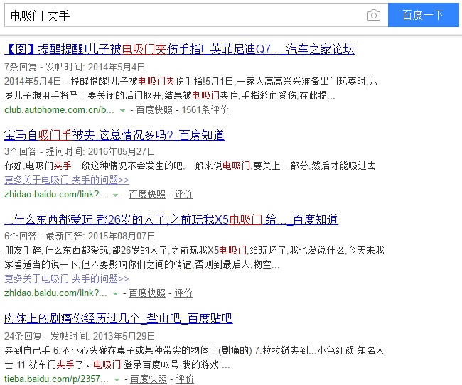写这篇文章是有原因的,全世界用德语的人不超过一亿,但在德语谷歌Google.de搜索德语类似关键词也能发现不少被电吸门夹手的媒体报道和论坛网友的讨论。而在百度搜索“电吸门安全”没有任何关于类似的文章和新闻,搜索“电吸门隐患”只有一条英菲尼迪论坛的帖子,是车友八岁的儿子手指被电吸门夹伤,搜索“电吸门 夹手”也只有论坛的三条相关信息,没有任何媒体的报道,而这就是今天要跟大家讨论的问题。