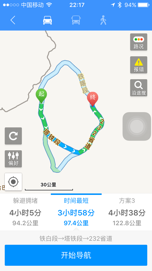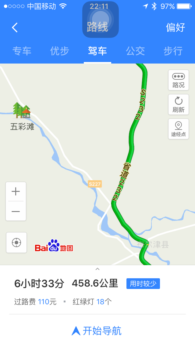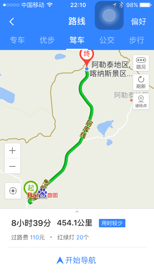 不知道你看懂这些导航截图了吗?没有百度地图水印的是高德地图。在百度地图上喀纳斯景区售票处排在第一的是白哈巴入口,这就是错误的根源,另外一个是从白哈巴到贾登峪的路只有从图四位置开过去,那条路是景区里的路,自驾车是不让进入的,所以那条路不存在。高德地图输入后会出来三个选择,我选择了最近的那条路,也是最难走的那条路。