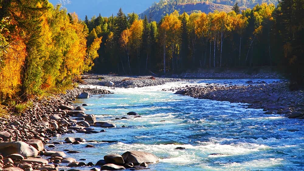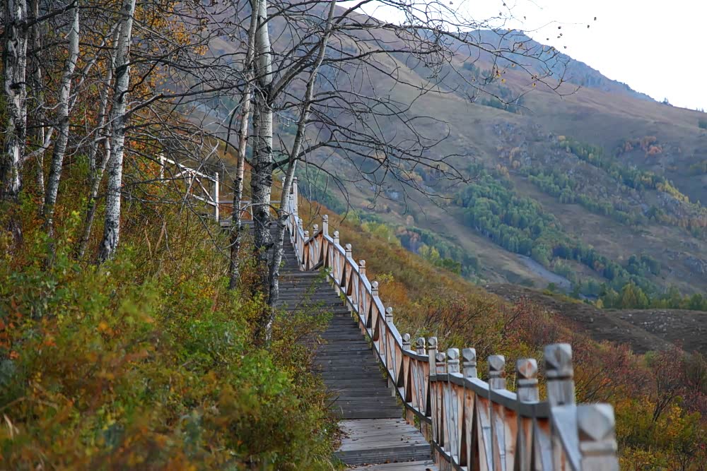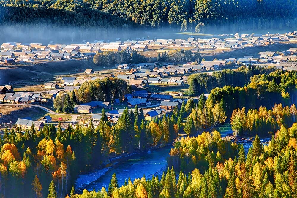 景区大门出来后,开上车,经过六十公里山路到达禾木景区大门,同样需要将车停在大门口停车场。购买门票和区间车车票后,乘区间车进入禾木景区,住禾木的小木屋。喀那斯区域最美的秋色在禾木,层林浸染,绚丽多彩,是一处典型的原始自然生态风光。
