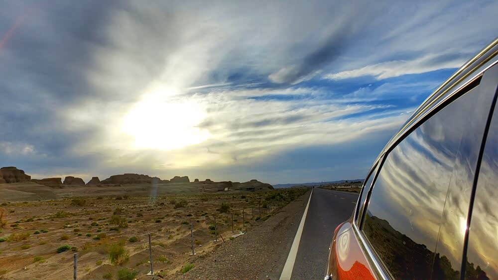 从克拉玛依出来后跑了四百多公里,半路遇到个加油站,没有97号油,没有加成,在如此的道路上,在低档位持续行驶的情况下,油消耗的很快,如何用有限的油,从这条原生态的道路中脱困。当看见很远的地方有车辆行走时,知道走出去不远了,太阳快要落山,美丽的晚霞好似在祝贺我们终于快要脱困了。在刚刚天黑时终于开到了贾登峪。