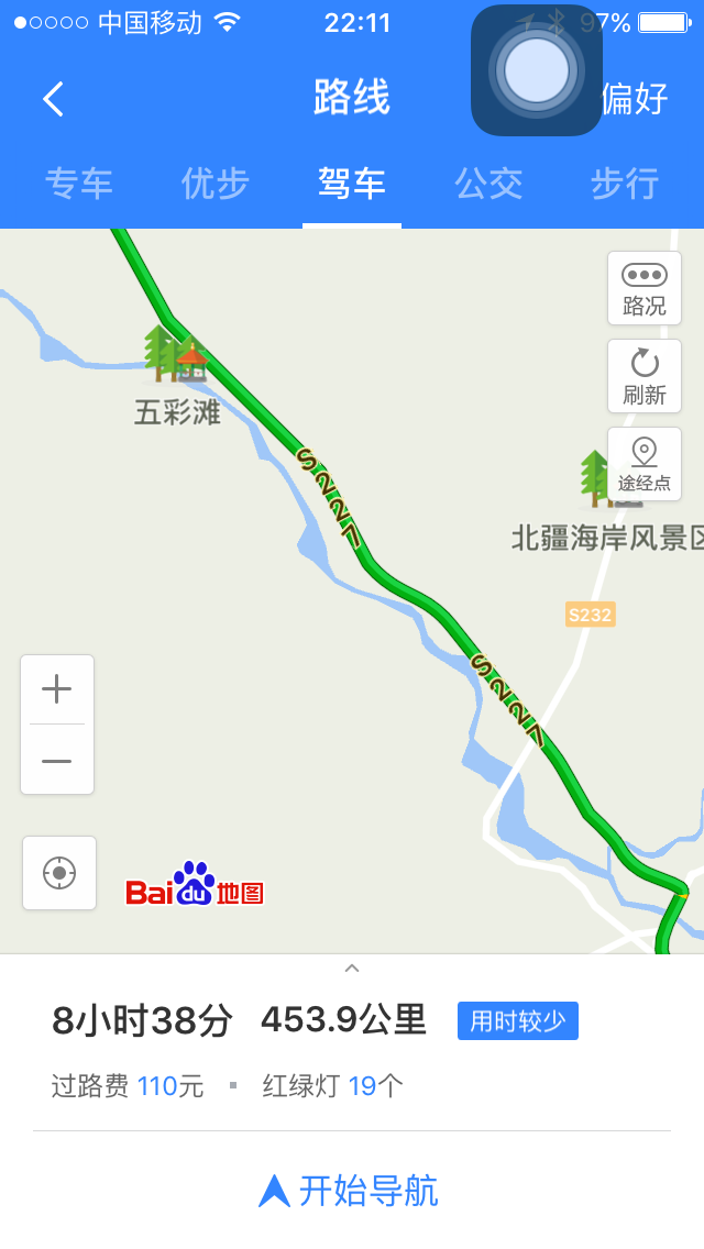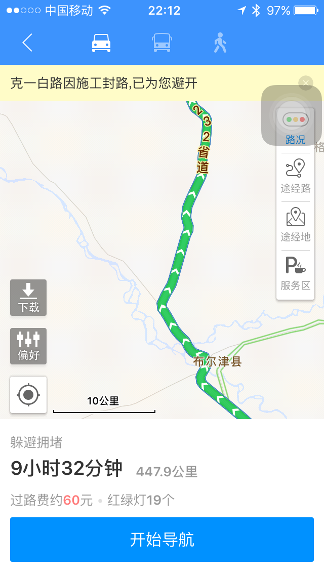 今日行程:正确道路地图标记460公里,修正道路又走了100公里,用时9个小时