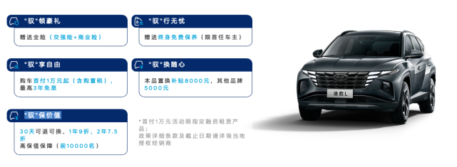 伴随着第五代途胜L的问世,北京现代更为这款车打造了五大超值购车礼遇:赠送全险(交强险+商业险)、赠送终身免费保养(限首任车主)、购车首付1万元起(含购置税)最高3年免息、本品置换补贴8000元其他品牌5000元、30天可退可换1年9折/2年7.5折保值率。
