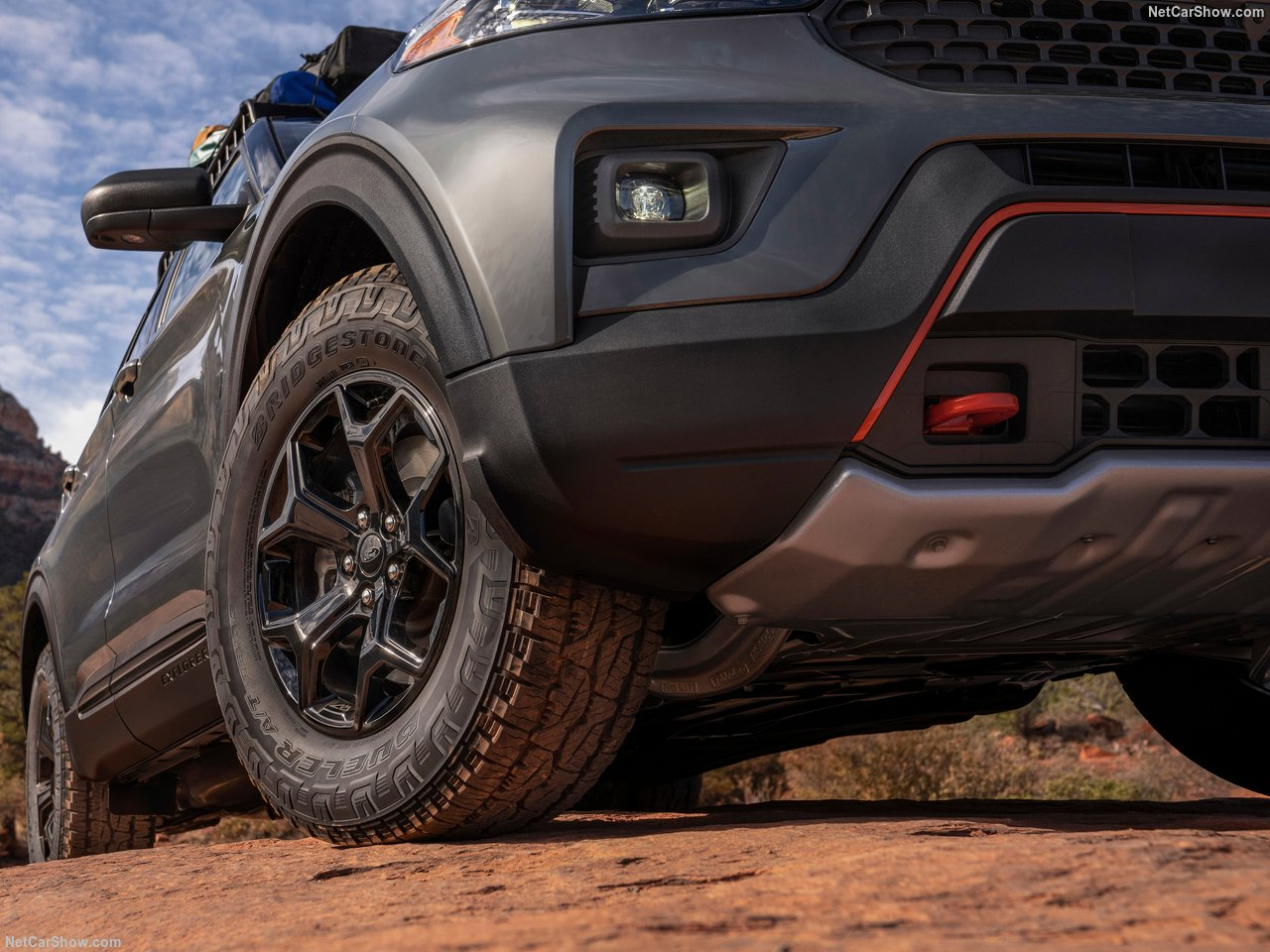 在福特探险者Timberline的底盘、发动机及变速箱的底部也加装了一系列的护板,能在越野的时候给予驾驶者更充足的信心。同时,车身底盘的高度也提高了0.8英寸,轮胎也升级成了普利司通的P265/65 R18全地形轮胎组合,独特的胎纹能在越野牵引力和静谧性方面得到一个相对的平衡。轮胎的接近角为23.5°,离去角为23.7°,最小离地间隙为8.7英寸,大大增强了车身越野能力。