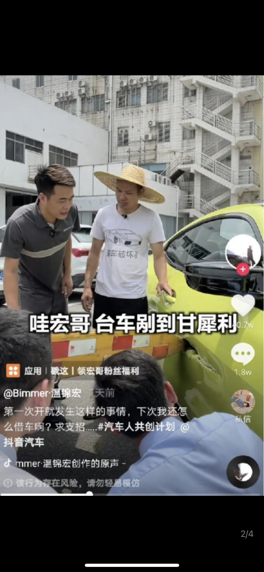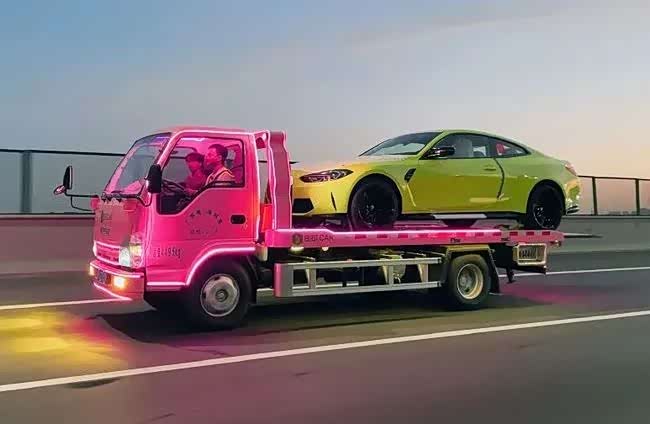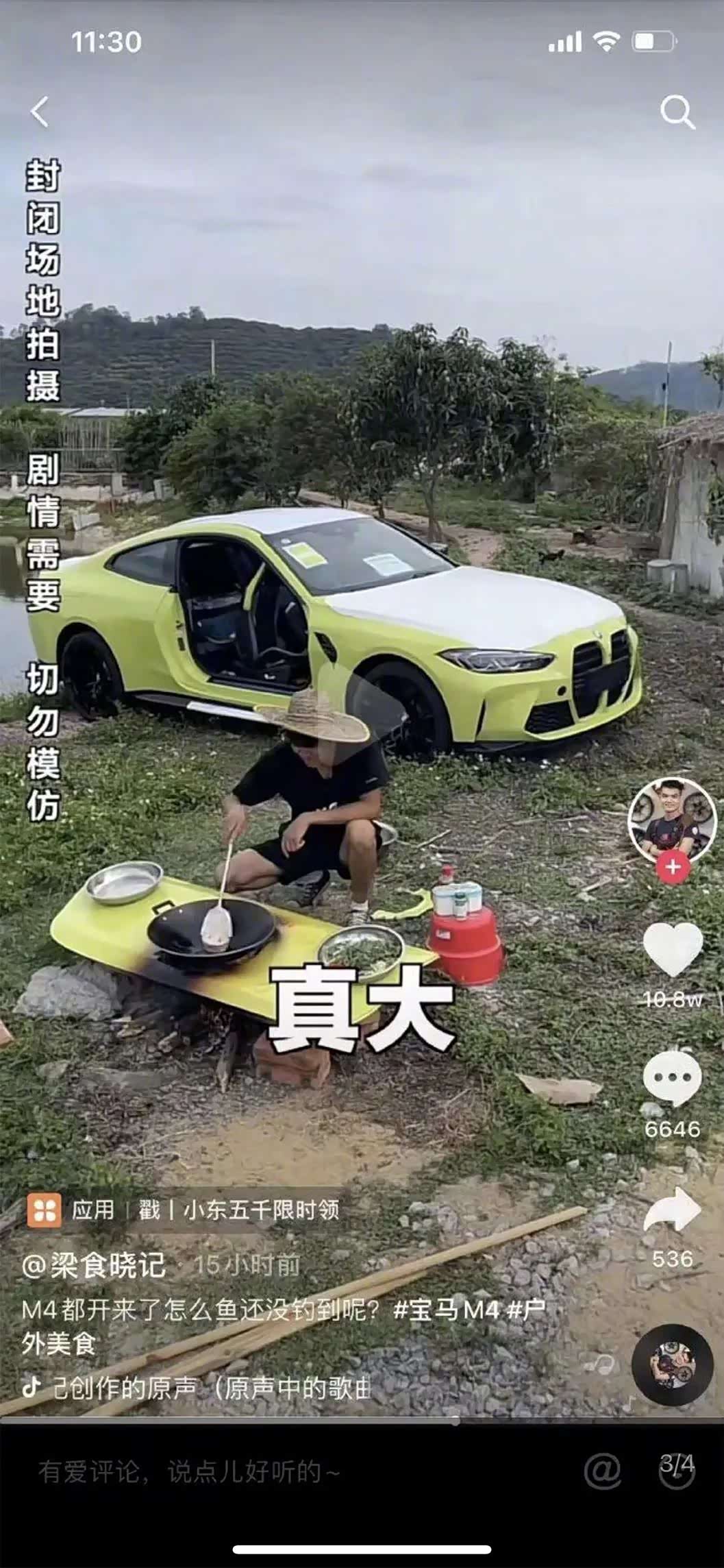 先捋一下大概经过:就是一个某音网红,买了台宝马M4,各种强调全国首台,还亲自开一台粉红色带有杀马特闪灯效果的拖车拉它回家,仪式感就像是风光娶回家的新媳妇。然后呢,接下来团队里另一个号,制造了一起人为剐蹭事故,就是直接戳穿了门板的那种破坏;再接着呢,就是再一个号用这个坏了的门板在野外炒菜。