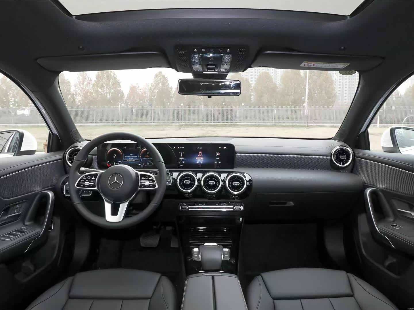 内饰的风格就很“奔驰”,经典的双联屏设计让人爱不释手,整车除了科技感外还营造出了很强的豪华感。大面积的皮质与金属装饰提升车内的质感。奔驰经典的圆形空调出风口很有设计感。方向盘同样也是平底造型。多功能的按键布局也非常合理,符合人机工学,使用一段时间后就可以盲操。
