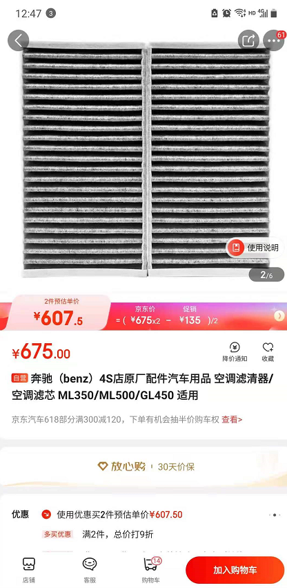 而且奔驰的零配件不便宜,每年换一次的空调滤芯就要675块。普通家用轿车买个原厂的空调滤芯100多也足够了,买个副厂的可能还不到100块。