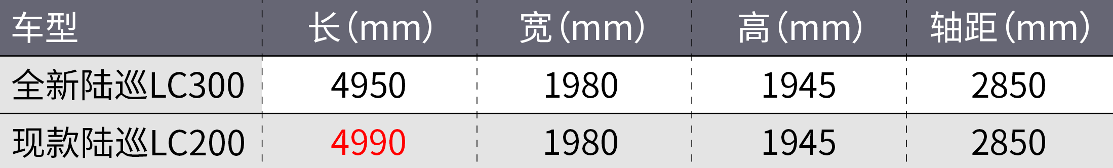 尺寸方面,全新陆巡LC300的车长相比LC200不升反降,缩短了40mm,而在宽度、高度和轴距上则保持不变。值得一提的是,陆巡这个2850mm的轴距自从1990年发布的LC80开始就一直沿用至今,看来丰田内部认为2850mm的轴距是一个可以在车内空间和越野通过能力之间相对平衡的数字。看到这或许会有同学好奇,三维尺寸没什么变化,是不是新陆巡就是一次换壳呢?首先告诉大家:不是!至于为什么,文章后面会有答案。
