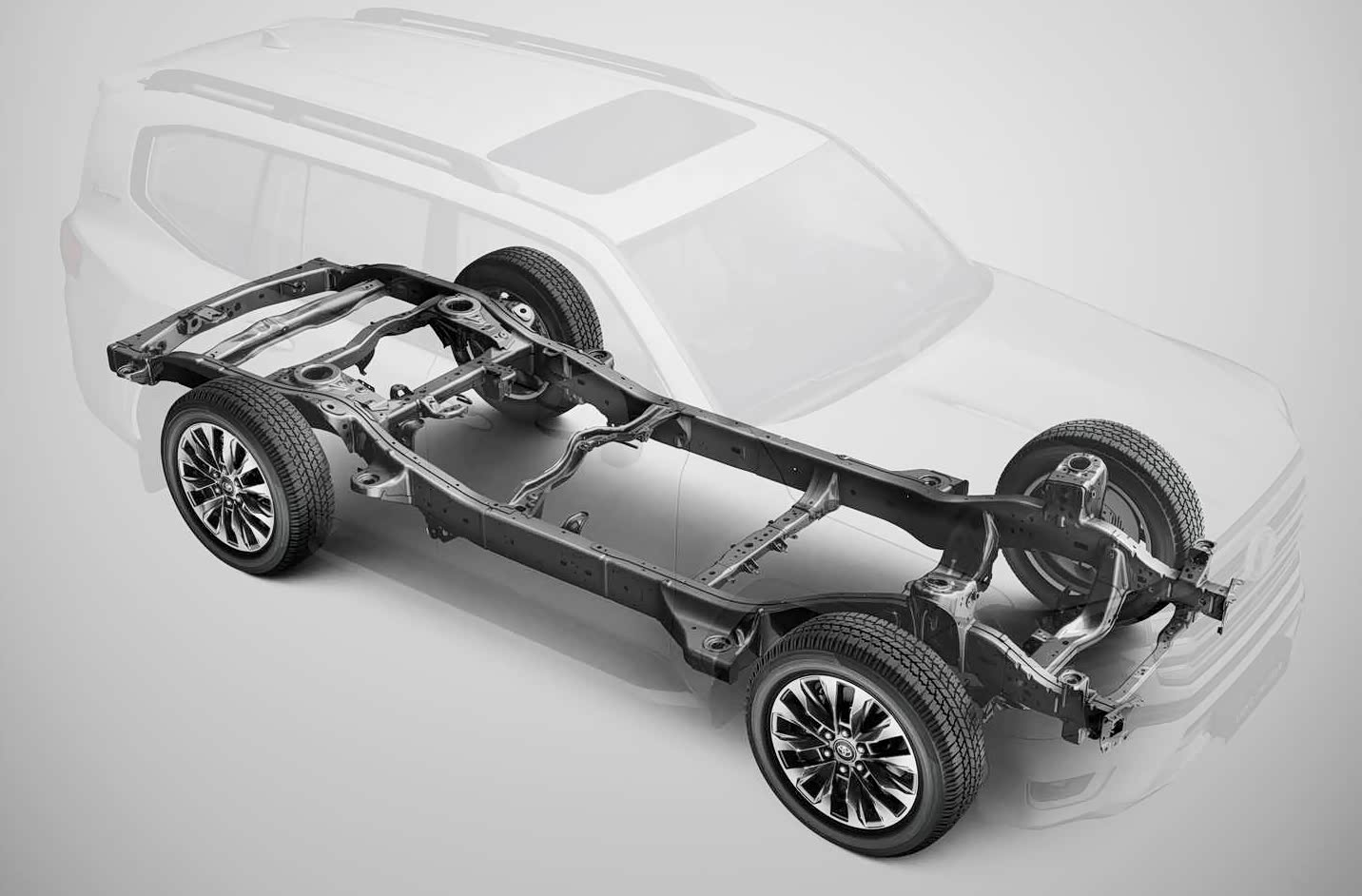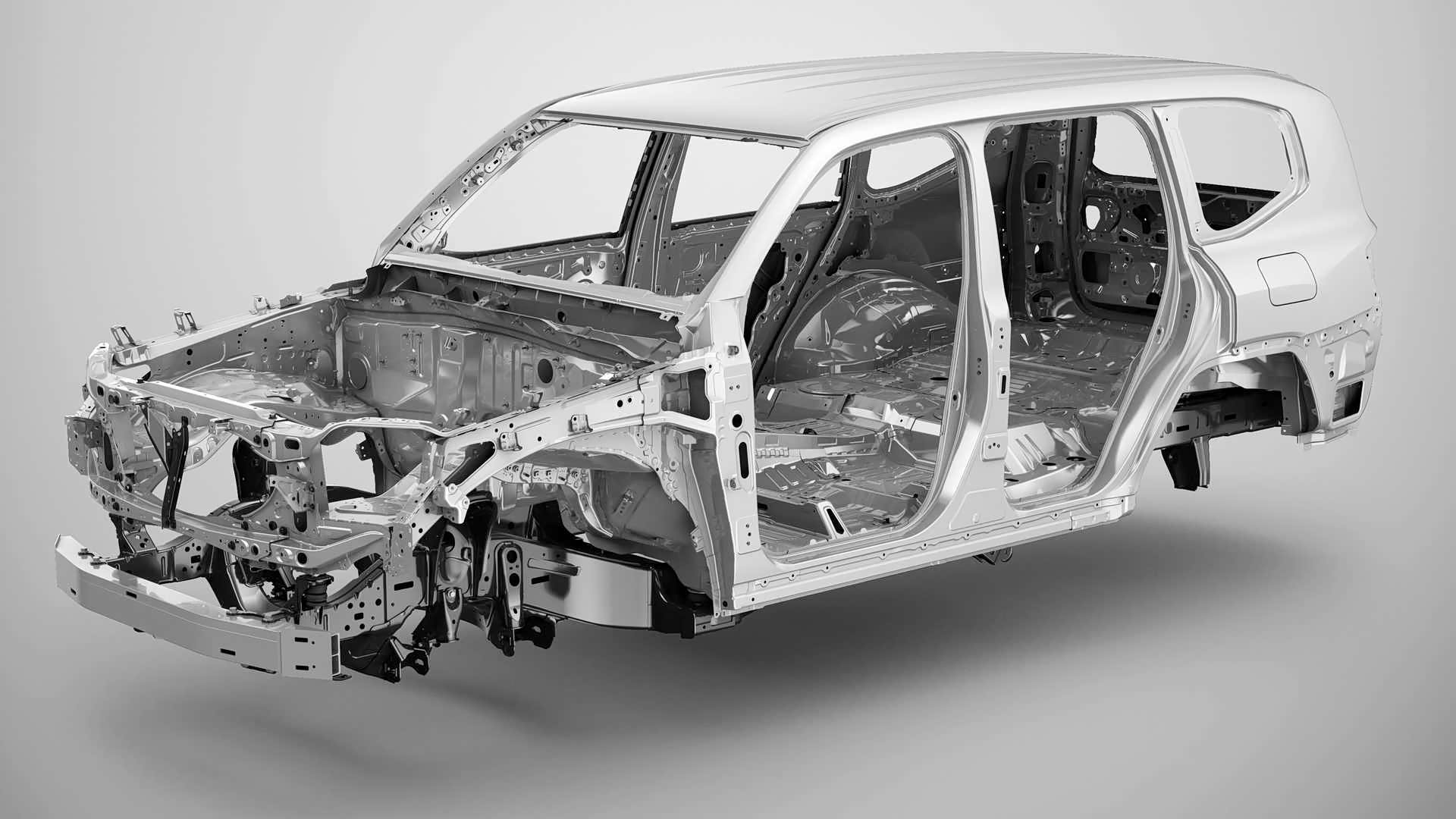 前面曾经说到,全新陆巡虽然三维尺寸与LC200没什么区别,但它不仅不是换壳车,而且还在平台架构上有了很大的升级。首先,全新陆巡使用了丰田TNGA架构打造,并且也是第一款采用TNGA-F平台的车型。这个平台专门用于生产带大梁的硬派越野车、皮卡车型。