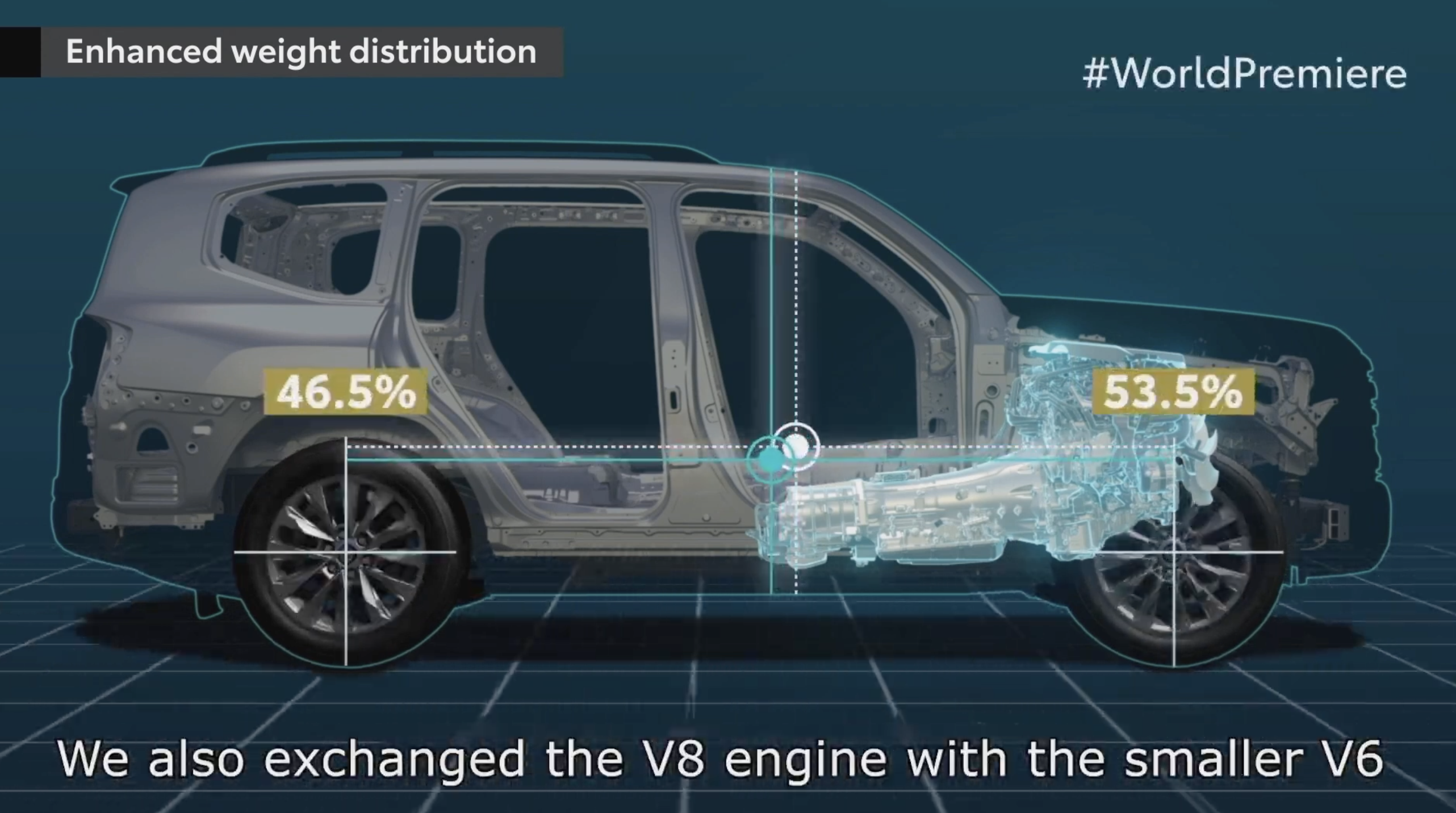 由于新一代车型不再搭载V8发动机,于是丰田工程师便将全新陆巡的V6发动机向后移动了70mm,安装高度降低了28mm。这个改变不仅让车辆获得了更低、更稳定的重心,同时还让车辆的前后配重比来到了53.5:46.5的水平。要知道,上一代宝马3系F30,它的前后配重比也不过54:46,陆巡相比3系甚至更接近前后50:50!再结合TNGA架构一贯出色的驾驶感受,相信全新陆巡在公路行驶能力上又会得到进一步的提升!