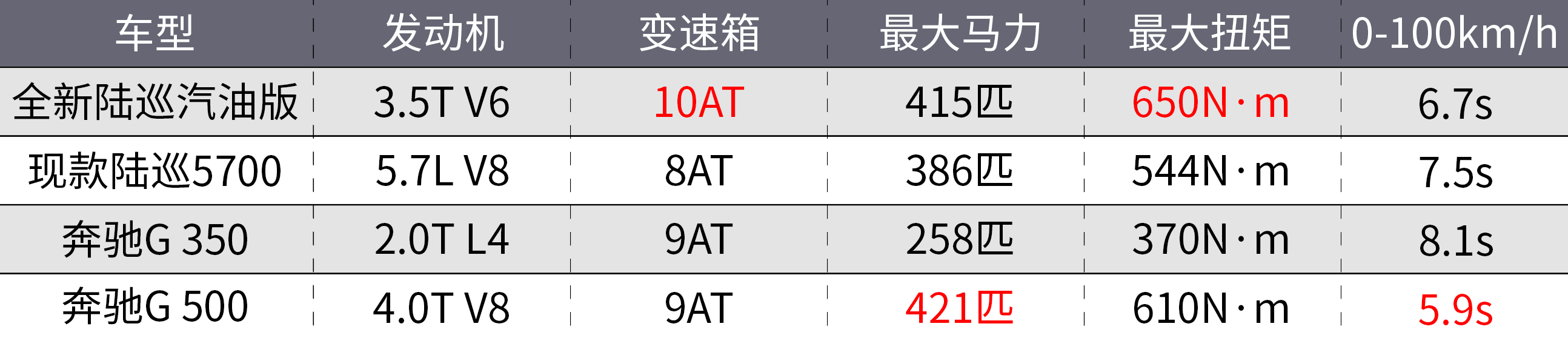 参数方面,这台源自雷克萨斯LS500的3.5T V6发动机可以输出415马力、650N·m的动力,参数不仅完全超越了老款的5.7L V8发动机,更是可以跟奔驰G 500的4.0T V8掰一掰手腕!在10AT变速箱的配合下,全新陆巡官方0-100km/h加速仅需6.7秒,已经比很多以性能著称的小钢炮还要快了!毫无疑问,全新陆巡的动力系统是整个陆巡车系中最强的一代!