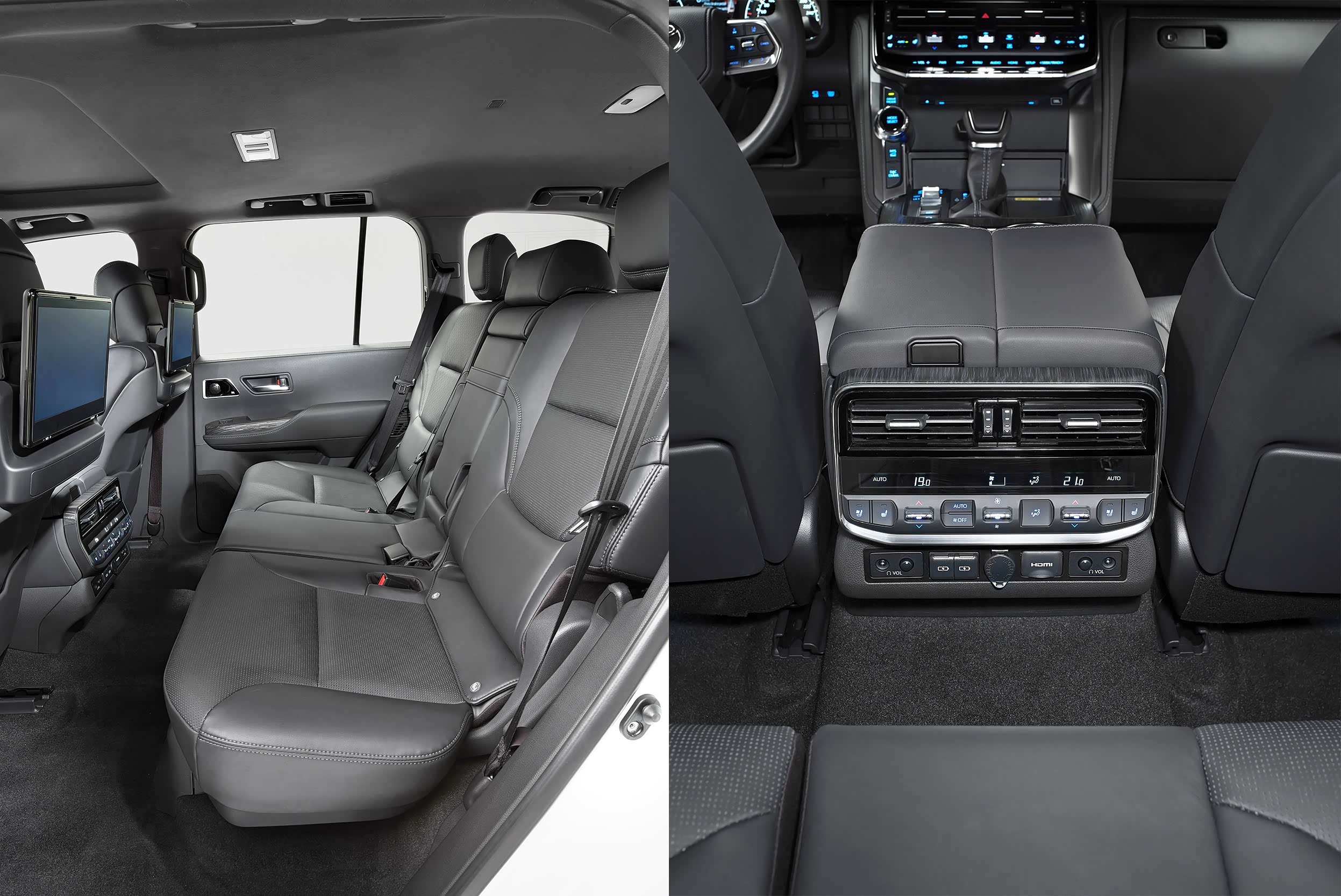 由于轴距没变,所以全新陆巡的后排乘坐空间并没有太大变化,但已经是非常宽敞了。此外,在后排配置方面,全新陆巡还提供了后排双多媒体屏幕、后排座椅加热通风、后排双温区独立空调、后排USB+点烟器电源等等,对于后排乘客的照顾还是非常到位的。但由于陆巡定位是硬派越野车,为了保证车辆的可靠性以及车身刚性,所以并没有使用全景天窗。