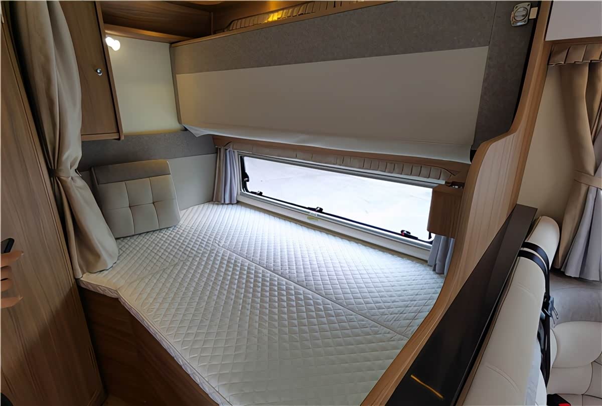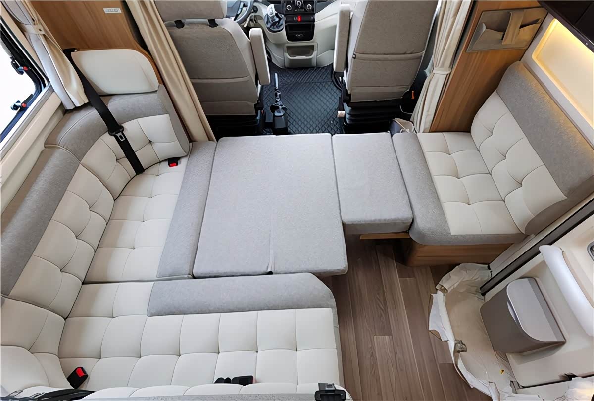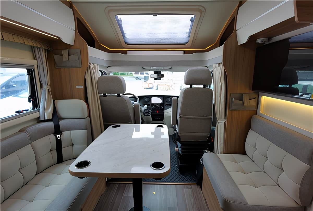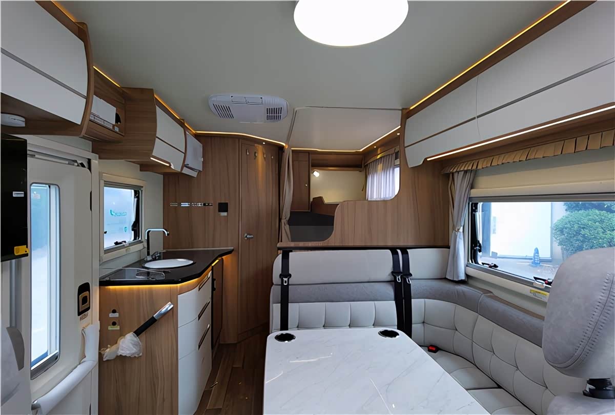 外观上,宾歌CX500与金冠房车一贯以来简约精致的外观设计风格保持一致,同时加入了一些独属于宾歌的创新元素。整车以白色打底,辅以三色拉花,有质感且充满活力。车体采用全铝合金的骨架,车顶为玻璃钢一体成型,T型的额头线条更加流畅,降低了风阻。