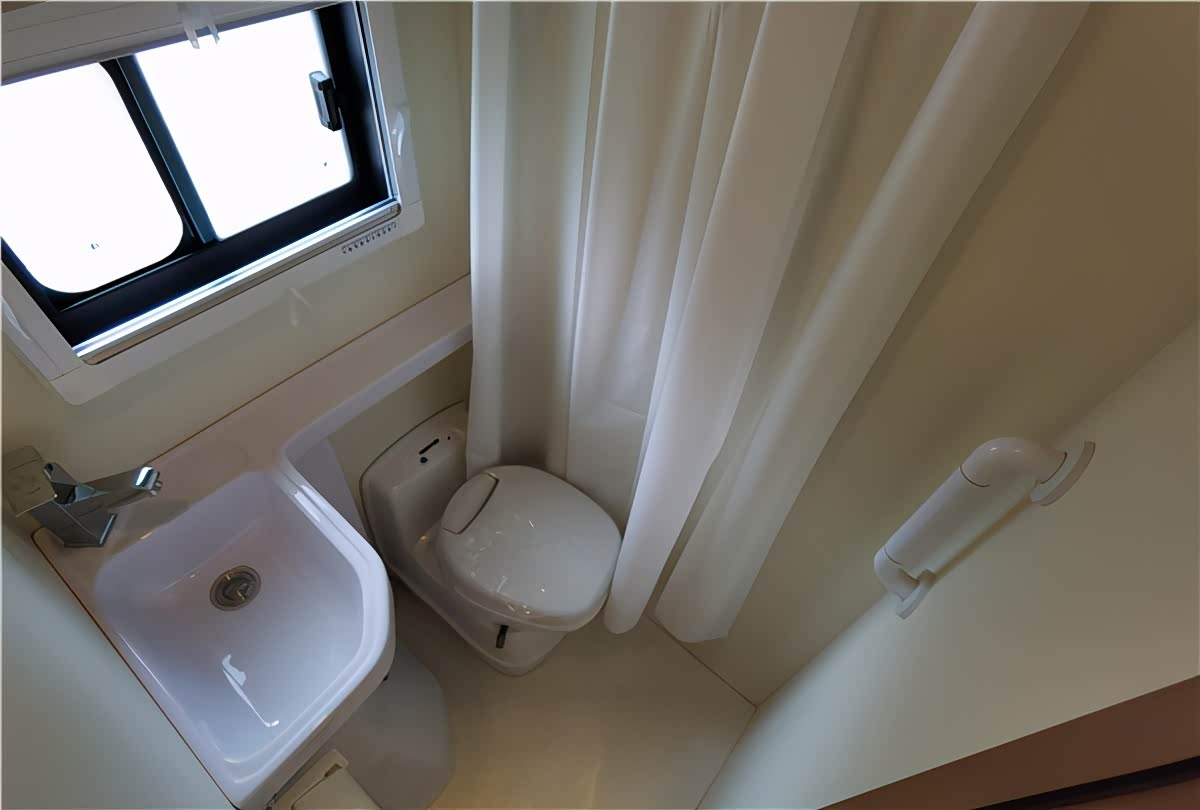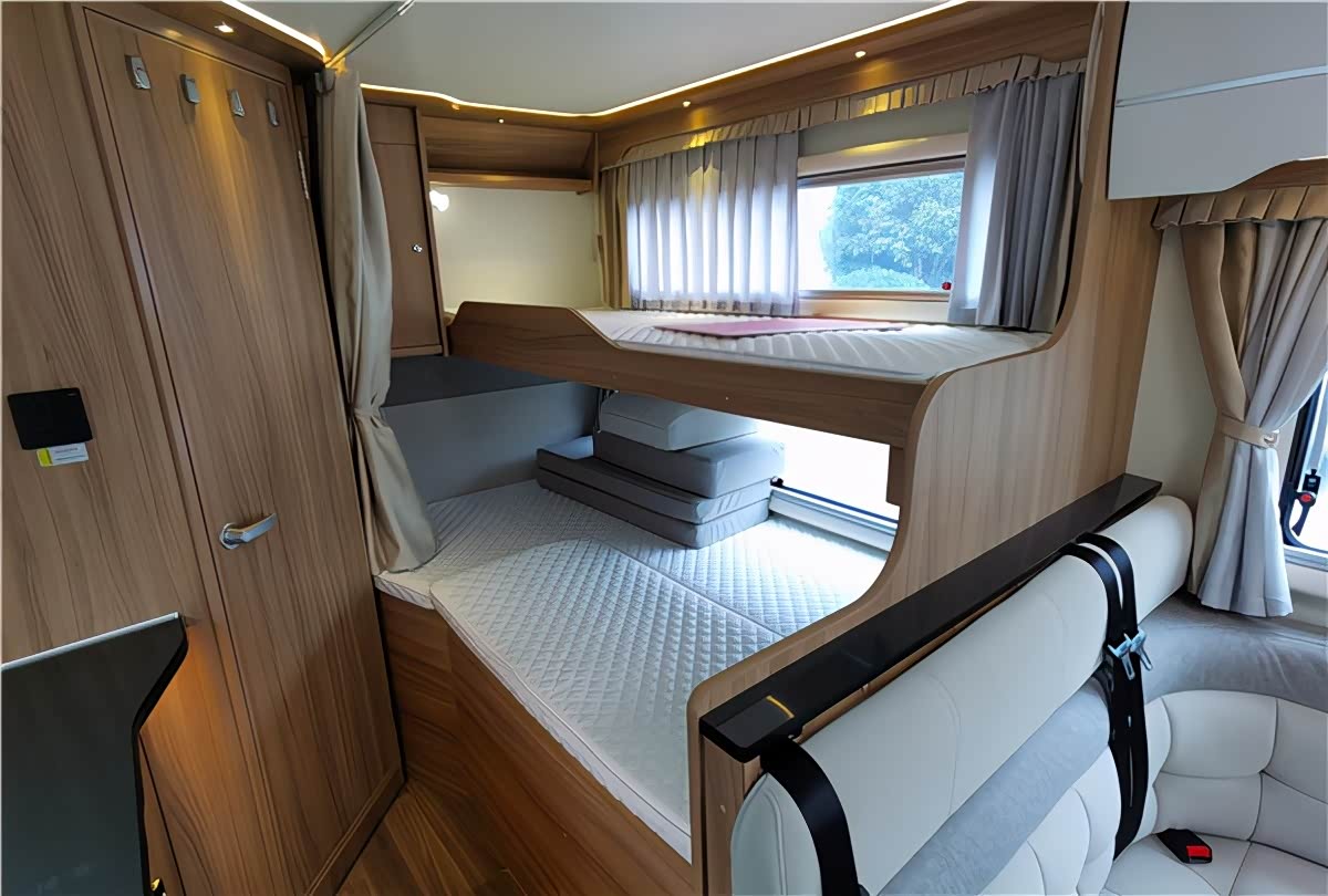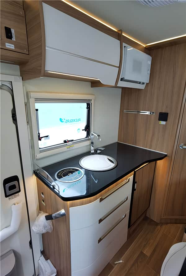 乘客门顶端依旧是整车内部的所有设备总集成,由于车内大功率用电器主要集中在车厢后半部分,所以这款车特意在中控面板安装了一款后舱电器总开关,提示最大功率不超过2800W,不使用电器的时候关闭即可,减小损耗。右侧是灯光、电磁炉,暖风设备和热水设备的开关。通过操作这里的按键发现,客厅顶灯通过开关能调节冷暖光。这款车采用的是燃油加热器+热水换热器搭配的形式,同样可以选配Truma Combi D6燃油锅炉,制热效率更佳,也更智能。
