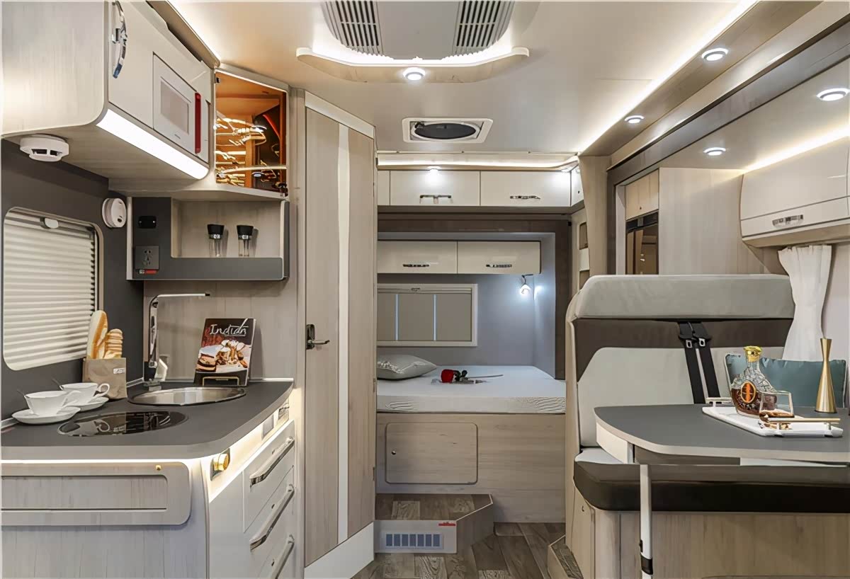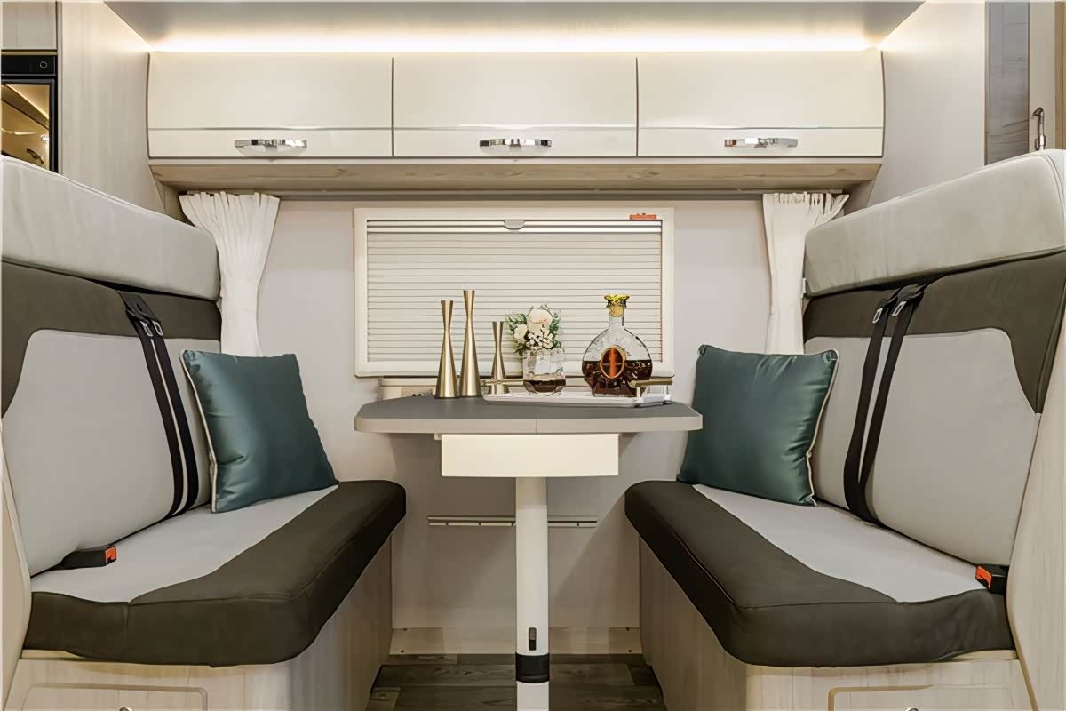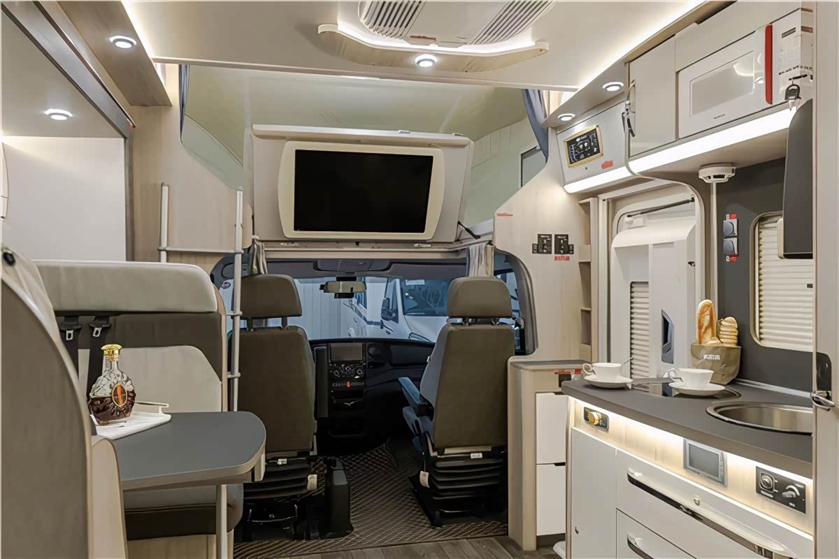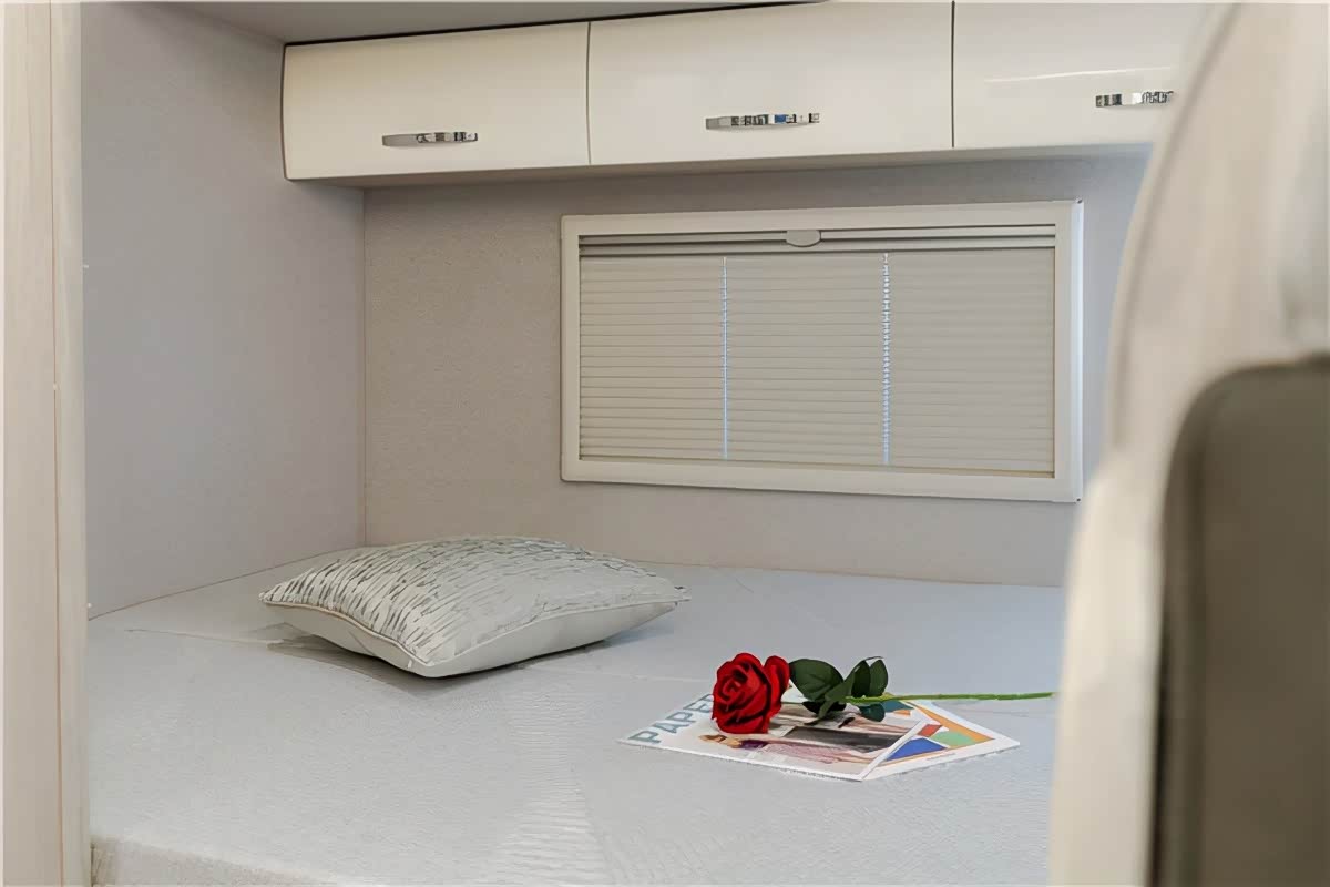 驾驶室上方额头双人床的设计,尺寸为2200×1500(mm),通过室内爬梯可上下往返,还是比较便利的,可满足两名成年人休息,两边配有外推窗,可保证足够的采光及空气流通;额头床翻折起来是一台32寸车载智能电视,此外驾驶室与车厢之间还配有隐私帘,保证了两边的隐私性;整车载客人数为6人。