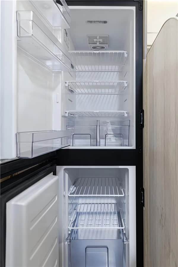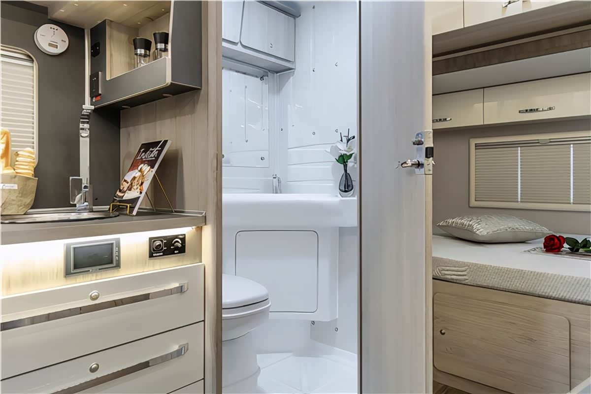 干湿一体的卫生间,内装便携式马桶,洗手台,化妆镜以及淋浴喷头等多种设备。该车的净水箱为180升,灰水箱为50升,采用专用的外接注水,水泵都是美国进口,并带有前置过滤器。
