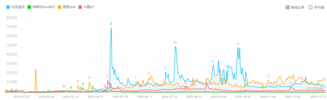 同时,对比比亚迪汉和其他品牌车企的车型热度,通过2020年的百度指数发现,比亚迪汉的百度搜索指数,在同级别新能源车产品中遥遥领先。