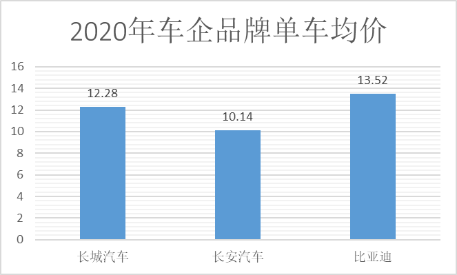 随着自主品牌的崛起,消费者越来越认可国产汽车的品质,中国汽车品牌形象已今非昔比。国信证券根据乘联会口径进行测算,2020年长城汽车的单车均价为12.28万元,长安汽车的单车均价为10.14万元,比亚迪则为13.52万元。