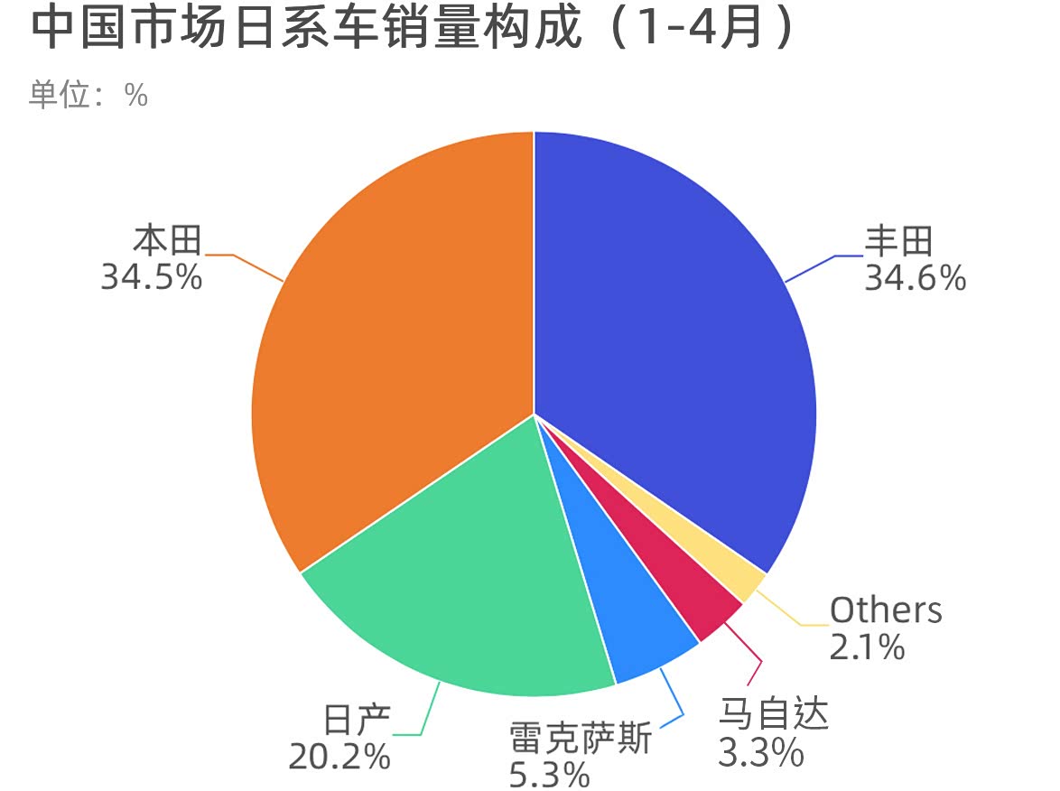 从上面的《中国市场日系车销量构成》饼状图不难看出,在今年1-4月日系品牌之中,丰田以极其微弱的优势领先本田,二者之间的销量差距只有不到1万辆,随时都有可能互换位置。而三剑客之中的日产则相对占比较低,1-4月销量只占到了日系品牌的20.2%。令人惊讶的是,全系纯进口的雷克萨斯居然拿到了5.3%的占有率,甚至比国产的马自达还要多了2个百分点。至于剩下的三菱、斯巴鲁、讴歌、英菲尼迪,就只能被划入“others”阵营了。因此,如果将雷克萨斯的销量算进丰田集团,那丰田还是当下妥妥的日系扛把子!