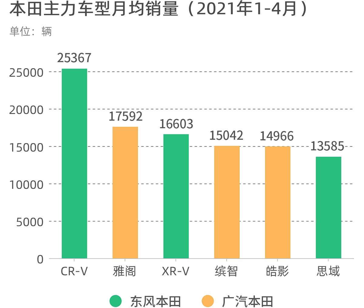 从月均销量来看,本田的表现也同样十分出色,月销量破万的车型就有6款,甚至比丰田还多了1款。但是从具体车型可以看出,本田目前在国内热销的车型都集中在25万以下的中低端市场,而且没有真正意义上的“大车”。