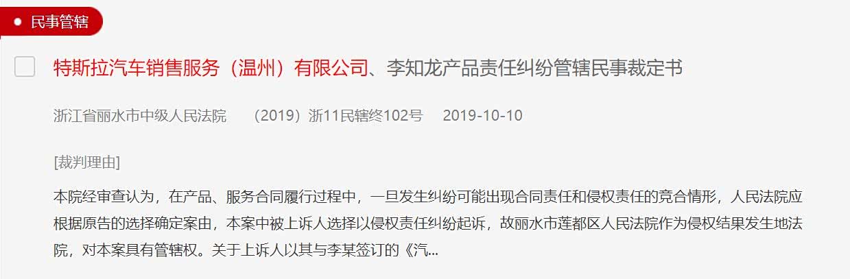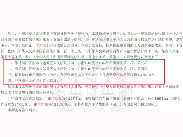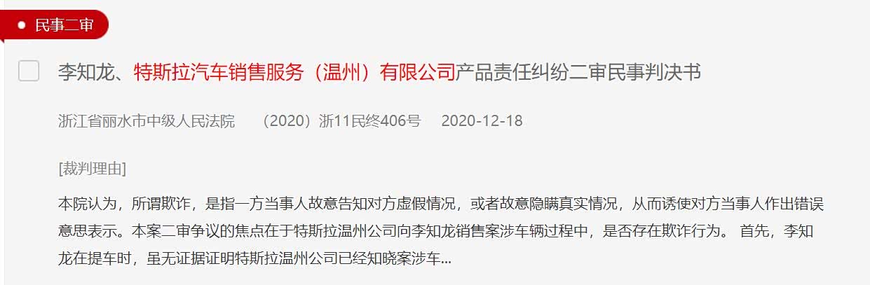 2019年10月在浙江省丽水市莲都区人民法院作出初审判决,车主李先生胜诉。特斯拉温州公司被判退还购车款778200元,以及退还车辆保险费16275.06元,并向车主赔偿经济损失180000元。但特斯拉遂方面还是向浙江省丽水市中级人民法院提起上诉。
