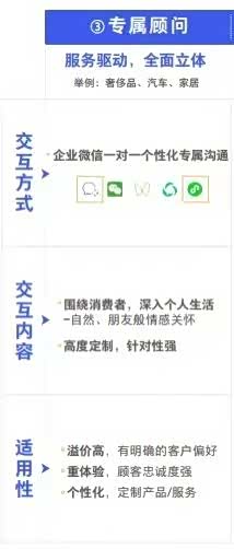 私域流量的“专属顾问”类运营模式是全面立体的服务驱动,包括:一对一个性化专属沟通,围绕消费者、深入个人生活的高度定制,适用性(溢价高、重体验、个性化)”: