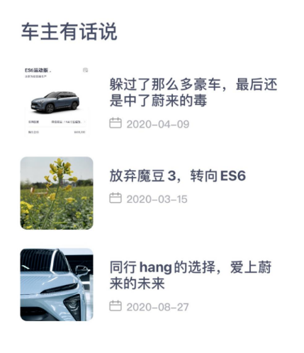 用户下载 App是为了选购或围观造车新势力的周边产品。对于一辆车而言,除了配置,产品口碑也是重中之重。社群中传播的信息正是社群提供给车主和潜在客户的一种收益,在社群中可以看到老车主的评价和选购时的心路历程,这样的资源足以引诱用户点进板块一探究竟。