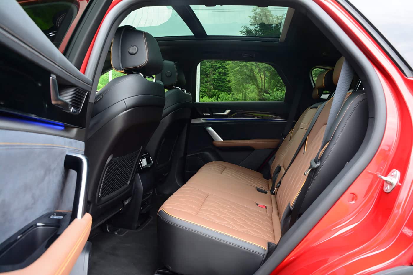 唐EV的第二排空间很宽敞,感觉很像坐进一台B级轿车后排。第二排座椅还具备前后移动功能,可以在第三排需要坐人时挪点空间给第三排乘客。而唐EV的横向空间是很宽的,加上纯平的地台,对第二排坐相对轻松的容纳三位乘客也很有帮助。第二排和第三排的“蹲腿感”都不明显,纯电车因为底盘平铺电池带来的车内上下空间局促的问题在唐EV这种大车上并不严重。配置上第二排除了提供空调操作面板,下面还有三相电源插座和两个USB,算是到位。