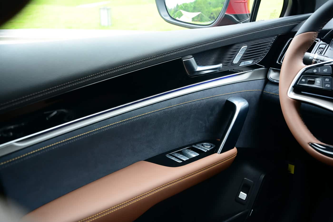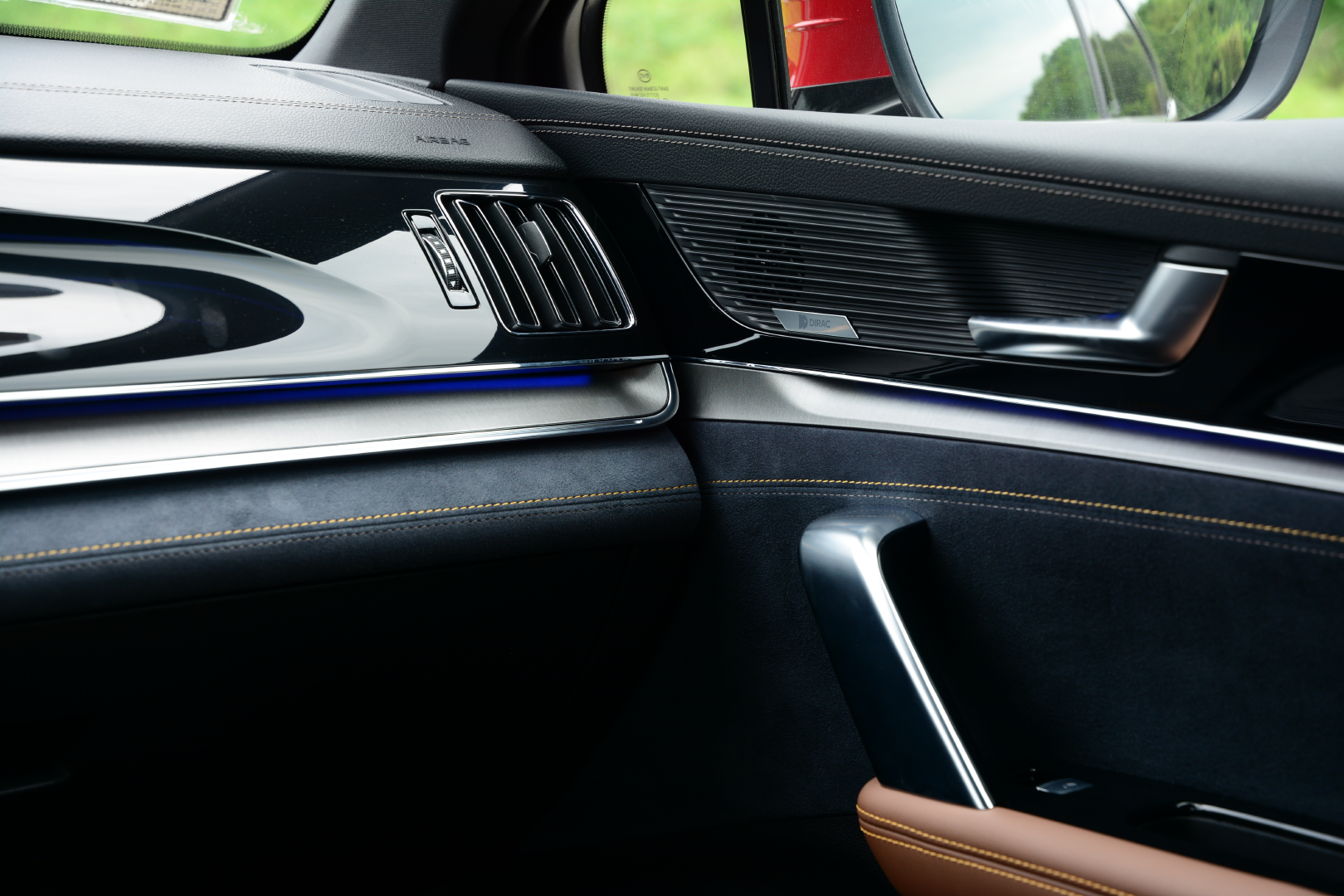 中控区域,动能回收力度调节的按钮很醒目,我就很需要这个,我开纯电动车时喜欢调到传统燃油车的驾驶感受,而不喜欢动能回收时明显的拖拽感。不过手机无线充电的位置比较靠后,拿取时不太顺手,好在尺寸够大能容纳下大叔们喜欢的超大号手机,且充电功率高达15瓦,比一般的无线充电要快。座椅皮料不错,菱形纹路带打孔,触感以及椅背、椅垫两侧承托都不错,还具备椅垫加长的功能。
