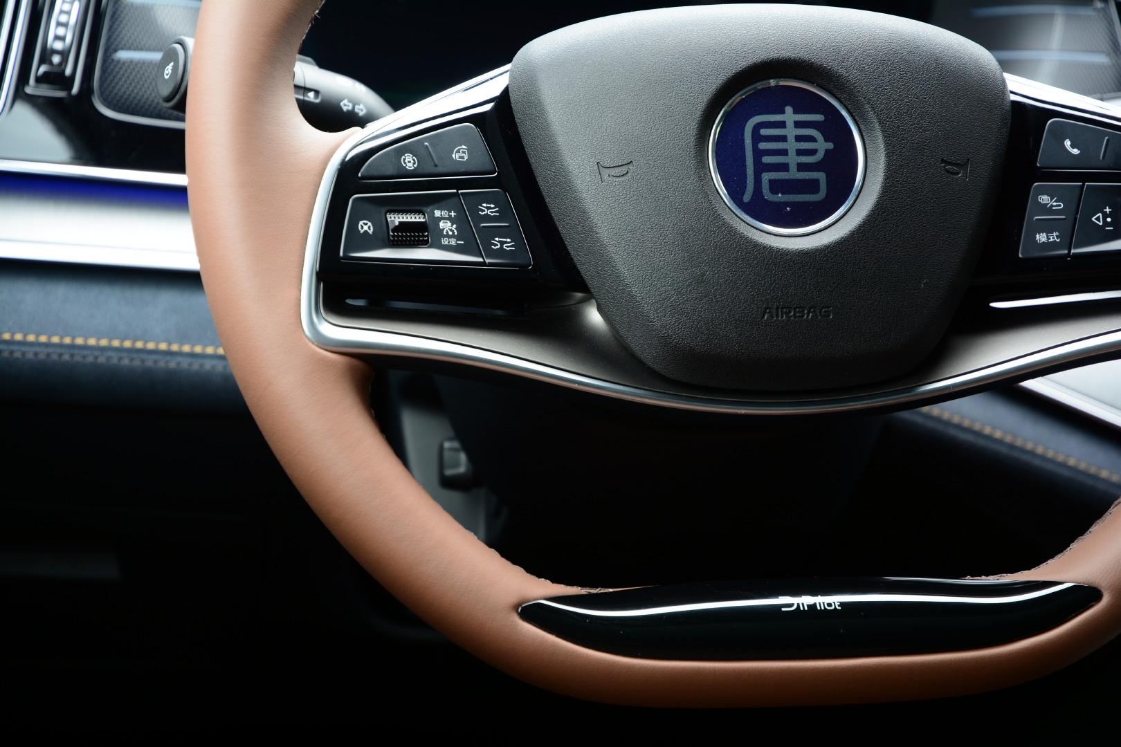 从车门开始,上面是柔软的皮革包裹,中间部分有钢琴烤漆、金属饰板,再往下居然是麂皮的材料,并且还有双色缝线。同样,正面仪表台也是这种多层次高级材料的结构,还采用了12.3寸全液晶仪表和15.6寸中控大屏,并且这个大屏是能够旋转成竖屏的、可以看抖音的高级货。比亚迪按惯例把“唐”的汉字Logo镶嵌在了方向盘中央,我觉得美学感受上就是比“宋”要好看些,不知道是不是唐朝本来比宋朝就更被人推崇。