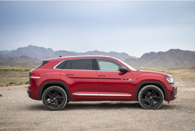 途昂X的车身尺寸与途昂略有不同,长宽高分别为4917/1989/1719mm,轴距同样为2980mm。C柱之后的Coupe造型,搭配更具动感的21寸五辐式黑色轮毂,以及红色涂装的刹车卡钳,使得途昂X的侧面更符合年轻人的审美标准。