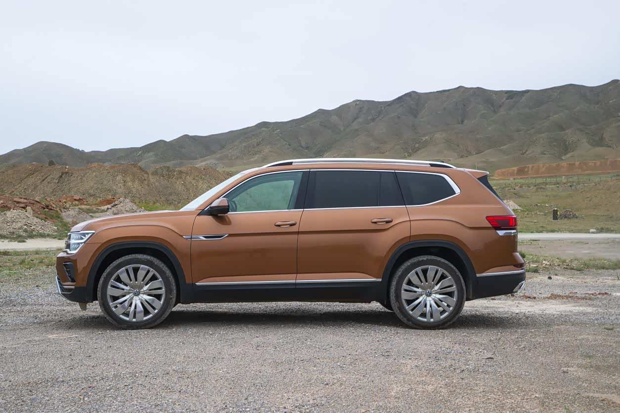 车身侧面,可以明显看出途昂和途昂X的区别。途昂采用与老款车型类似的传统中大型SUV车身设计,车身长宽高分别为5052/1989/1773mm,轴距为2980mm。全新样式21寸7辐式铝合金轮毂,跟车身线条一样饱满,但个人感觉视觉效果一般,缺乏一定的精致感。