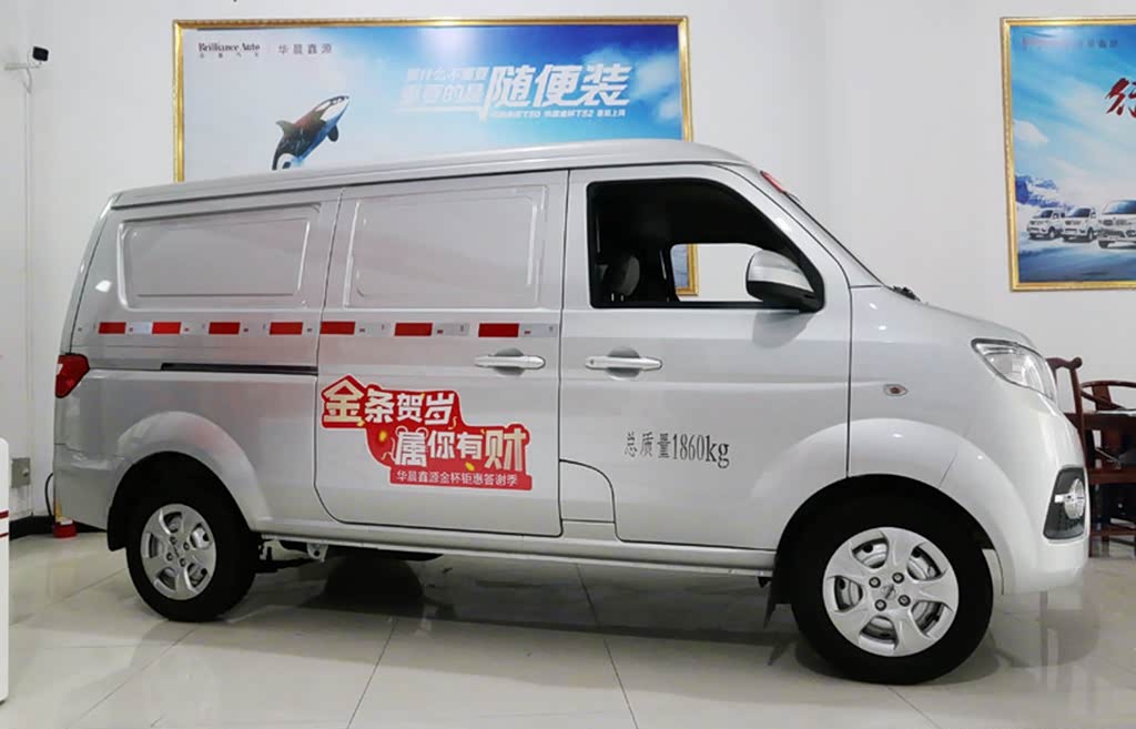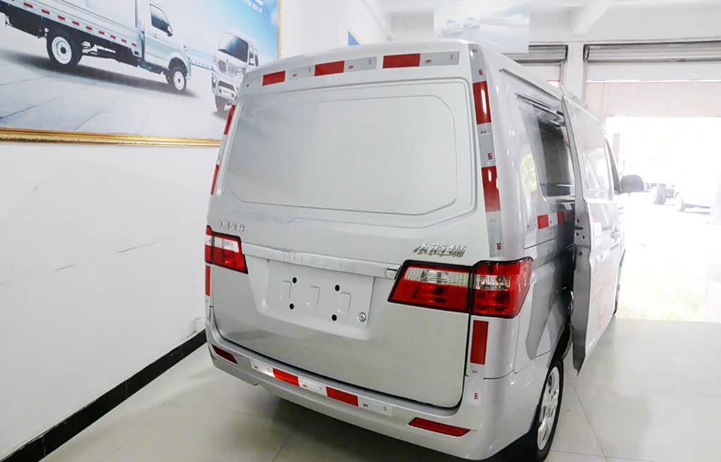 厢货版的车尾也是采用了封闭式的后窗并且用3M反光警示条进行了勾勒,整体造型方方正正的,依旧是面包车的经典姿态。