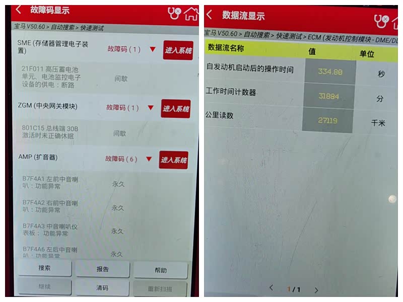下面就是OBD行车电脑的检测,可以看到车身控制模块存在多个故障代码,很多是改装音响留下来的故障代码,后期检查清除就可以了。变速箱和发动机的公里数,以及发动机工作时间换算,和表显基本一致,公里数正常。