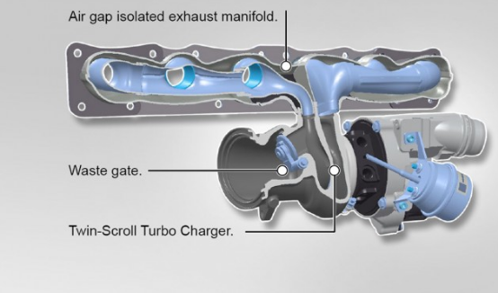 N55采用CCM(Cylinder-bank Comprehensive Manifold)短小的高度集成型排气歧管,意在降低压力波动从而减小油门迟滞和排气的回压:涡轮增压器转子由两组排气管路驱动,1-3号气缸和4-6号气缸分属于两组排气管路分别向增压器供气。