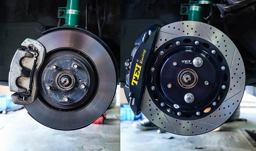 我们来对比一下,原厂的卡钳碟与tei卡钳碟盘,差别还是很大的。原车刹车碟尺寸小,摩擦面积小,盘面没有花纹增加摩擦系数。最重要的是,原厂碟是实体碟,没有通风槽散热,耐高温性能差,高速刹车安全系数低。