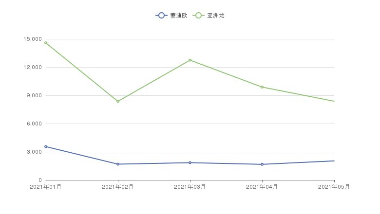 销量往往是购车的重要参考,根据众车网汽车行业数据监测显示,从2021年05月终端的销量来看,蒙迪欧的销量为2027辆,亚洲龙的销量为8371辆,亚洲龙要比蒙迪欧多售出6344辆。